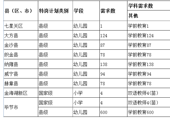 毕节市2016年第二阶段特岗计划学科需求情况统计表(含威宁县)