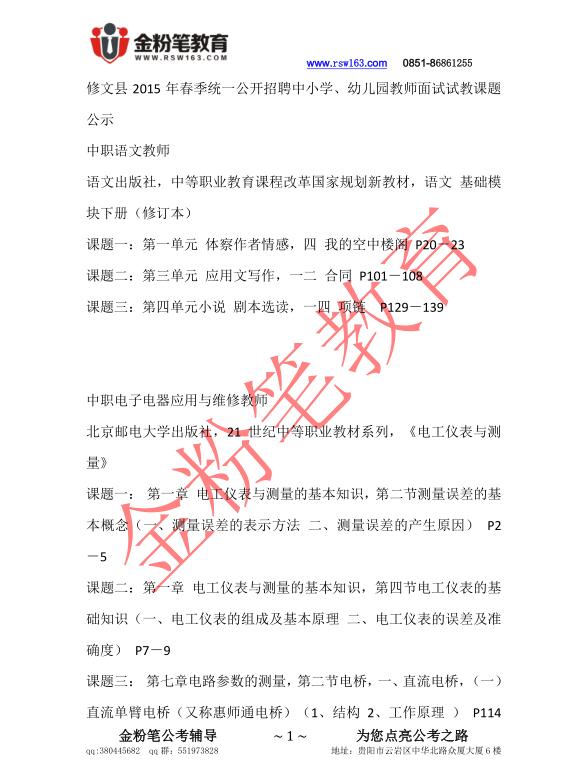 修文县2015年春季统一公开招聘中小学、幼儿园教师面试试教课题