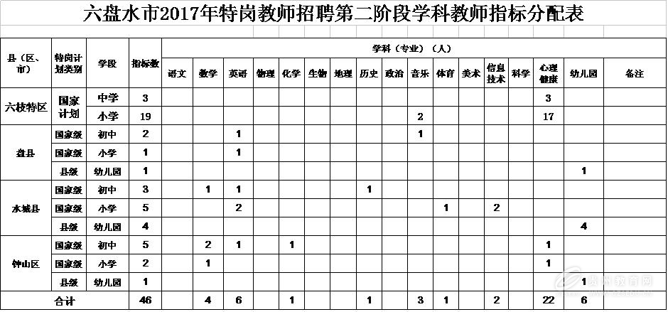 六盘水市2017年特岗教师招聘第二阶段学科教师指标分配表