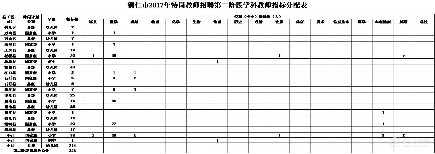 铜仁市2017年特岗教师招聘第二阶段学科教师指标分配表