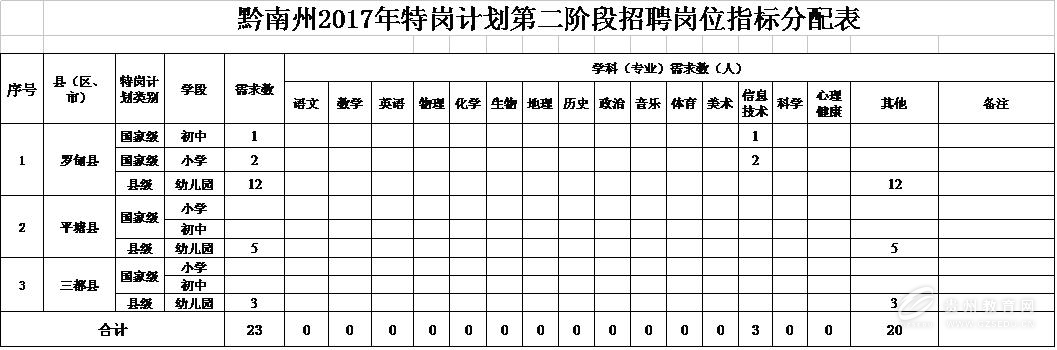 黔南州2017年特岗计划第二阶段招聘岗位指标分配表