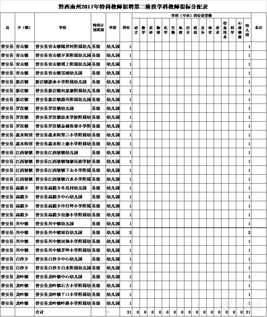 黔南州2017年特岗计划第二阶段招聘岗位指标分配表