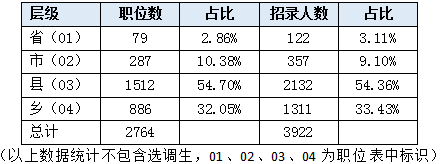 本次考试中省、市、县、乡四级机关均发布招录计划,其中县级职位数最多,为1512个,占总职位数的54.7%,其次是乡级职位,占比为32.5%,从上述数据可看出,县乡基层职位占到总数的86.75%,接近九成。