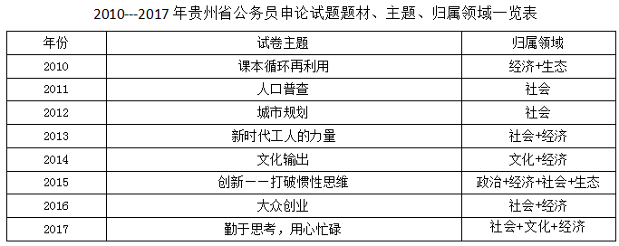 从上表中我们能够看到,贵州省考申论偏重于考查社会、经济领域。2010—2017年的公务员考试有六次涉及社会领域,六次涉及经济领域,三次的主题是经济和社会的交叉融合,有两次是单纯的社会类主题,主题为人口普查、城市规划。可见,贵州申论主题考查较为复杂多变。所以,考生在复习时要对各个领域都有所涉及,尤其要注意社会、经济类主题以及在此主题基础上的交叉融合。