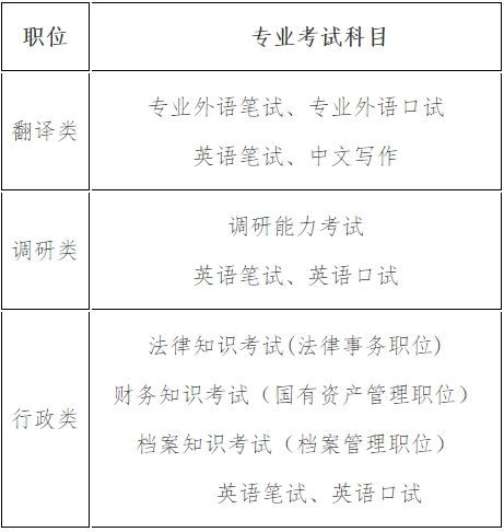 翻译类重点考查考生本专业外语的听、说、读、写、译等基本功;调研类重点考查考生的调研理论基本功、文字表达能力和英语水平;行政类重点考查考生的本专业知识和英语水平。全体考生均需参加心理素质测试(笔试,不计入考试成绩)。报考英语翻译职位的考生,参加专业外语笔试,不再进行英语笔试。