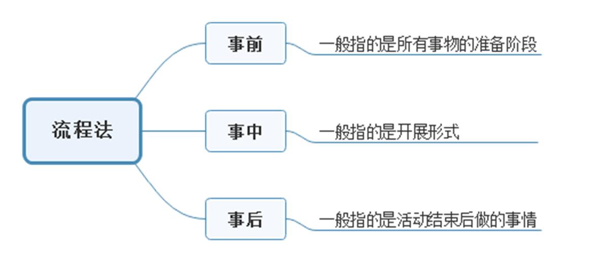 流程答题法:是以时间为标准,将一个活动组织过程分为事前、事中、事后三个阶段,每个阶段又可以根据活动本身的特点分为若干个环节。