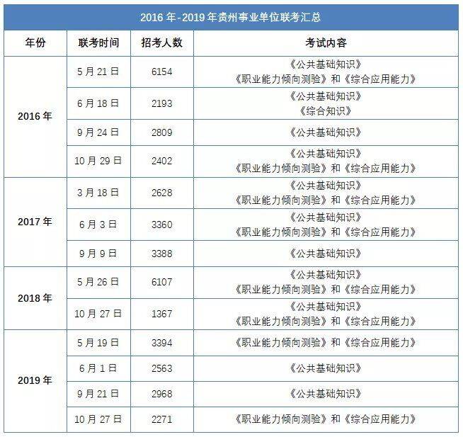 以下为2016-2019年贵州事业单位联考时间、招考人数及笔试科目一览表