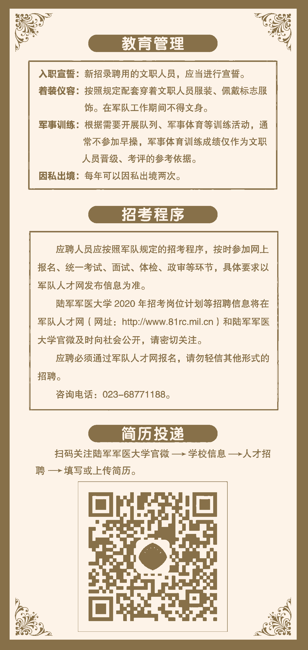 应聘专业教学、科研、医疗岗位的,-般应具有博士研究生学历学位;应聘实验、工程、其他卫生技术等岗位的,应具有硕士研究生以上学位学历;护理岗位适当放宽。具体岗位需求见附表《2020年面向社会公开招考文职人员岗位分布表》。有报名意向全军面向社会招聘文职人员的考生到咱们公务员考试吧这个微信公众号下载职位表报名参加考试。