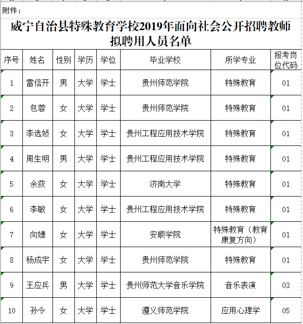 一、威宁自治县特殊教育学校2019年面向社会公开招聘教师拟聘用人员名单见附件;