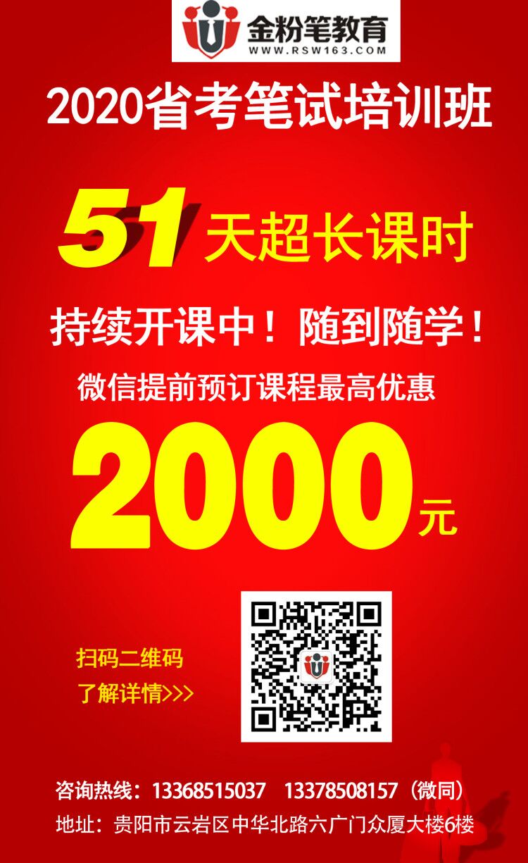 163贵州人事考试信息网提示:在2020年度贵州省公务员招录考试前,为了更好的帮助考生提升考试成绩,金粉笔教育2020年省考招录笔试培训班已开设,2020年贵州省考笔试培训课程班次设置及省考笔试培训价格等可以查看,需要参加2020省考笔试培训的考生,可以选择适合自己的班次,详情课程可咨询课程表中的预约课程电话。