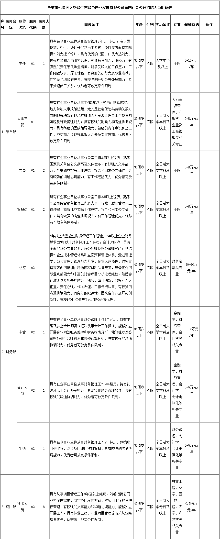 见《毕节市七星关区毕绿生态绿色产业发展有限公司面向社会公开招聘管理人员职位表》。(见附件1)