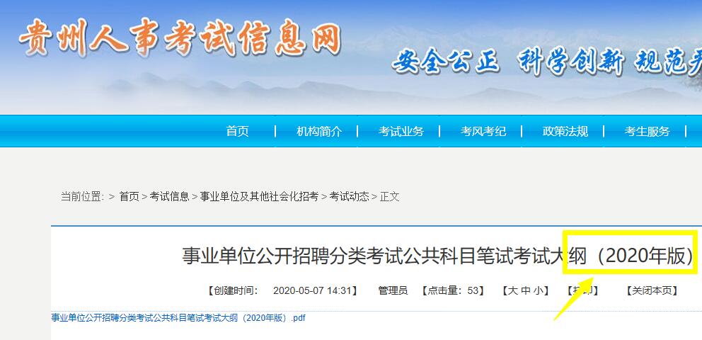 贵州事业单位招聘考试信息网提示:2020年贵州事业单位招聘分类考试大纲已发布,分为综合管理类A类、社会科学专技类B类、自然科学专技类C类、中小学教师类D类、医疗卫生类E类等,考试科目均为《职业能力倾向测验》和《综合应用能力》。