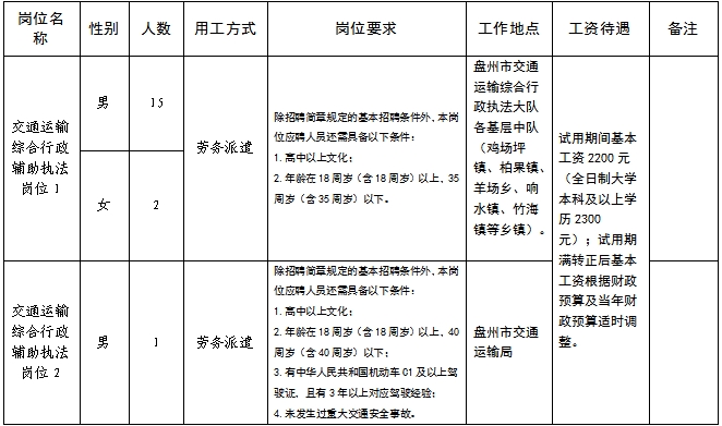 为进一步强化盘州市交通运输局辅助执法人员队伍建设,按照相关规定,结合工作实际,盘州市交通运输局拟面向社会公开招聘交通运输综合行政辅助执法人员,为确保本次招聘工作顺利完成,现将有关事宜公告如下: