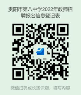 1.凡符合应聘条件者,请用手机扫描下方二维码,按实填报《贵阳市第八中学2022年教师招聘报名信息登记表》。填写时请确保所提供的个人信息真实有效,若因提供虚假信息或隐瞒相关情况影响录用的,后果自行承担。