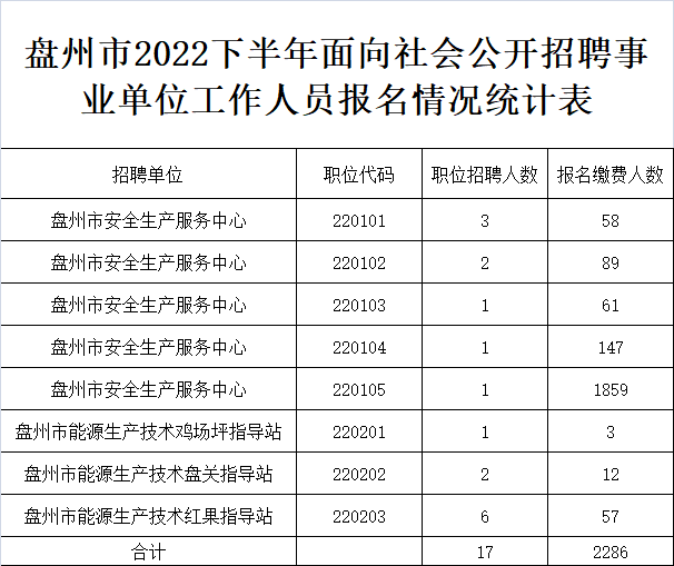 盘州市2022下半年面向社会公开招聘事业单位工作人员网上报名工作已结束,根据《盘州市2022下半年面向社会公开招聘事业单位工作人员简章》规定,现面向社会公示各职位报名人数。