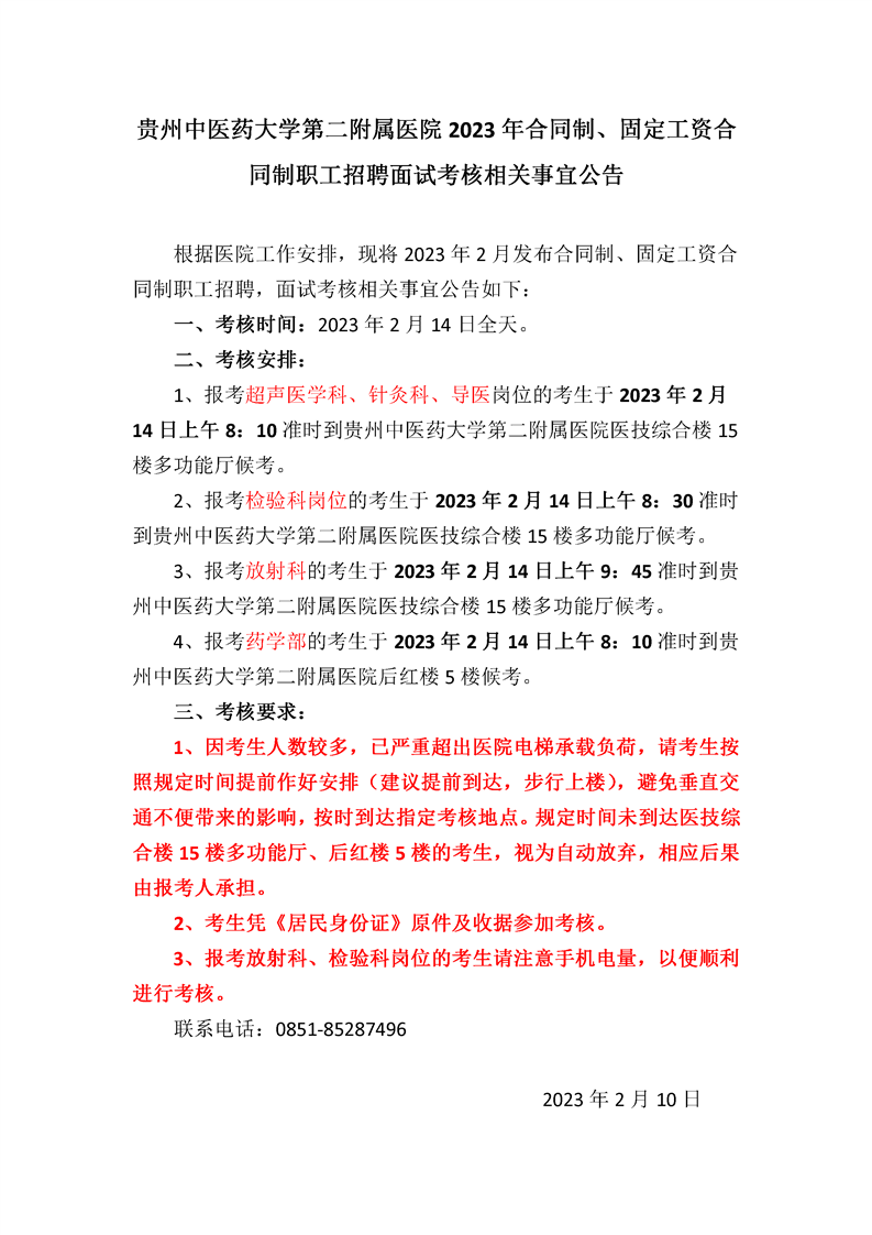 贵州中医药大学第二附属医院2023年合同制、固定工资合同制职工招聘面试考核相关事宜公告(2月14日考核)