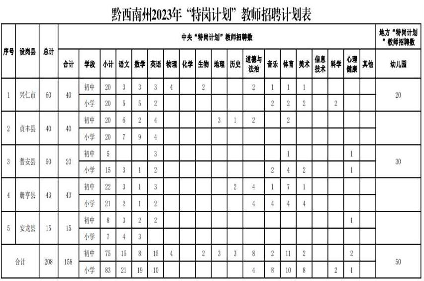 黔西南州2023年“特岗计划”教师招聘计划数为208名,其中,中央“特岗计划”教师招聘158名,用于招聘农村初中、小学教师;参照中央“特岗计划”,实施地方“特岗计划”教师招聘50名,用于招聘农村幼儿园教师。各设岗县分学科岗位招聘计划详见《黔西南州2023年“特岗计划”教师招聘计划表》。