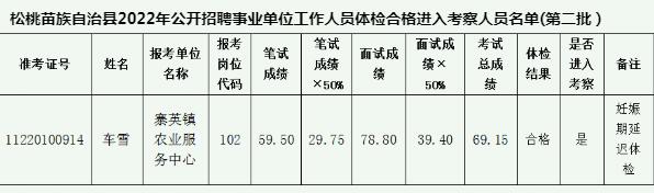 根据《松桃苗族自治县2022年事业单位公开招聘工作人员简章》的规定,2022年松桃苗族自治县事业单位公开招聘体检工作已完成,拟对体检合格人员车雪(详情附后)及考察有关事宜公告如下: