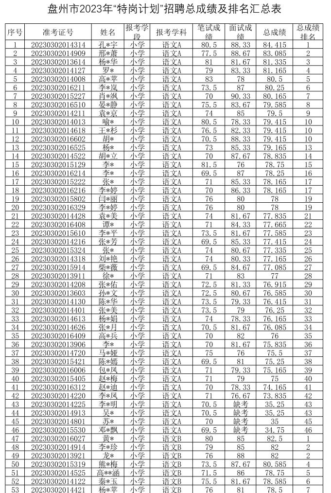 盘州市2023年“特岗计划”招聘面试工作已结束,现将总成绩及排名予以公示,公示期为3天:2023年7月26日至2023年7月28日。
