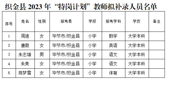 附件:织金县2023年“特岗计划”教师拟补录人员名单