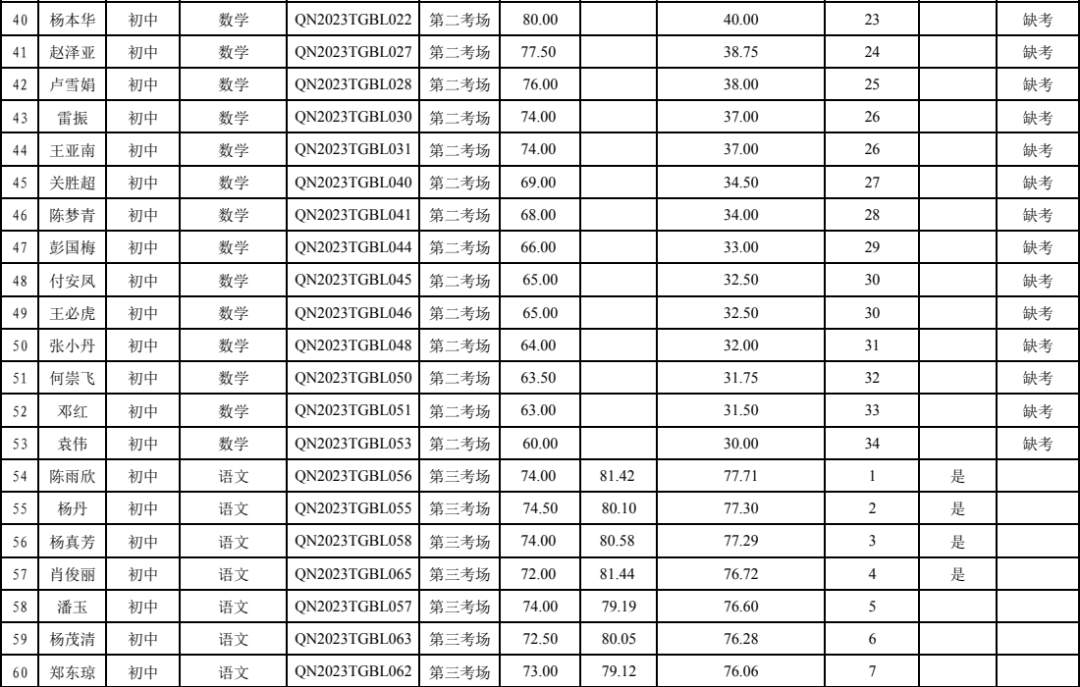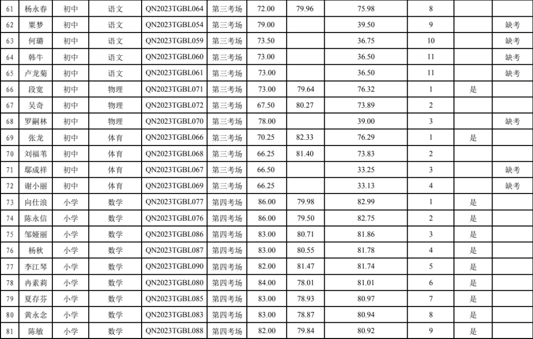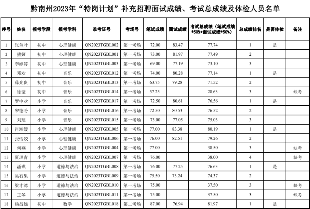 黔南州2023年“特岗计划”补充招聘面试成绩、考试总成绩及体检人员名单