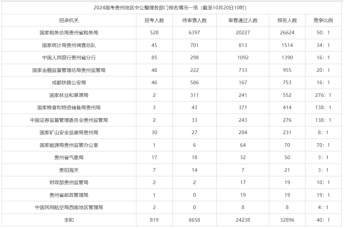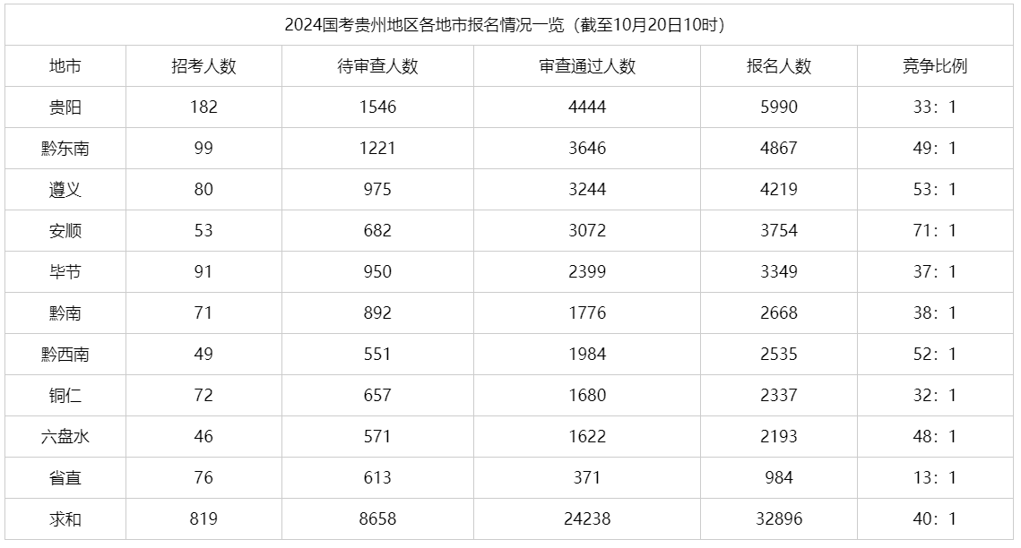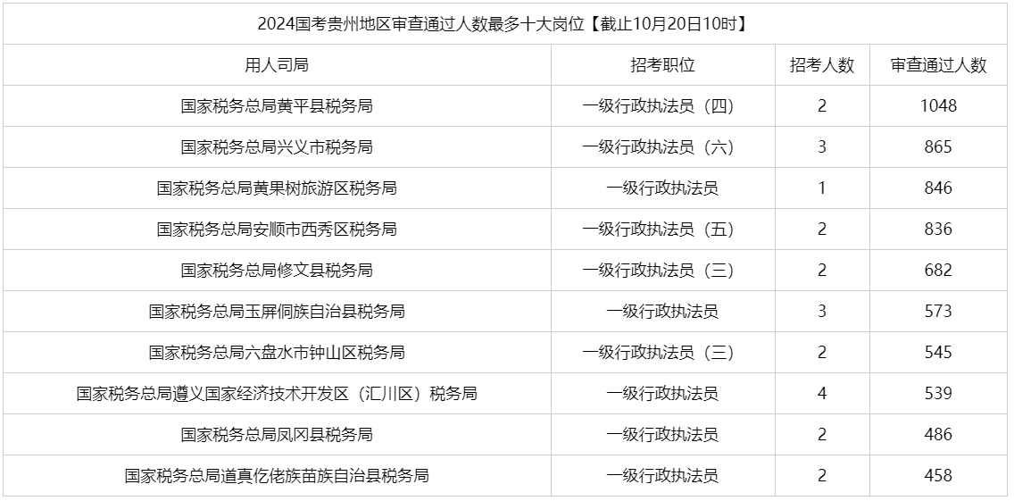 2024国考贵州地区审查通过人数最多十大岗位【截止10月20日10时】