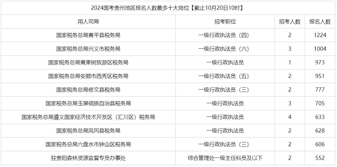 2024国考贵州地区报名人数最多十大岗位【截止10月20日10时】