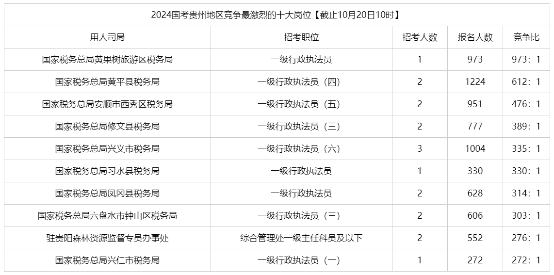 2024国考贵州地区竞争最激烈的十大岗位【截止10月20日10时】