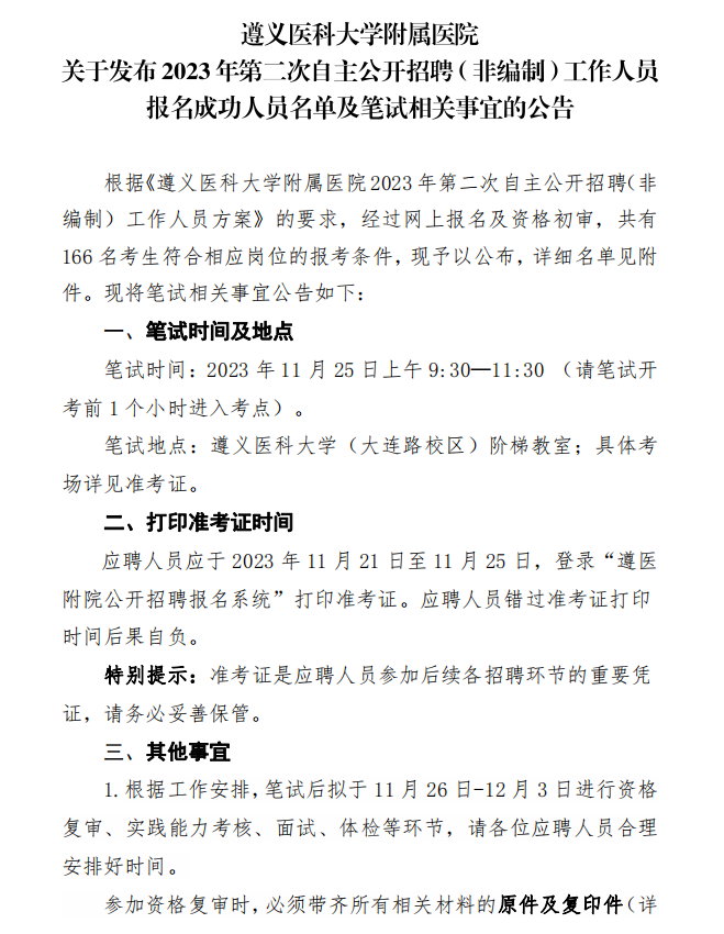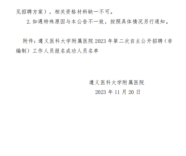 遵义医科大学附属医院2023年第二次自主公开招聘(非编制)工作人员报名成功人员名单及笔试公告(11.25笔试)