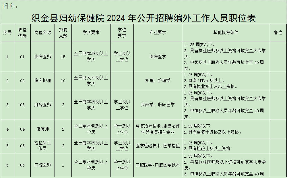 招聘职位及要求详见《织金县妇幼保健院2024年公开招聘编外工作人员职位表》(以下简称《职位表》,见附件)。