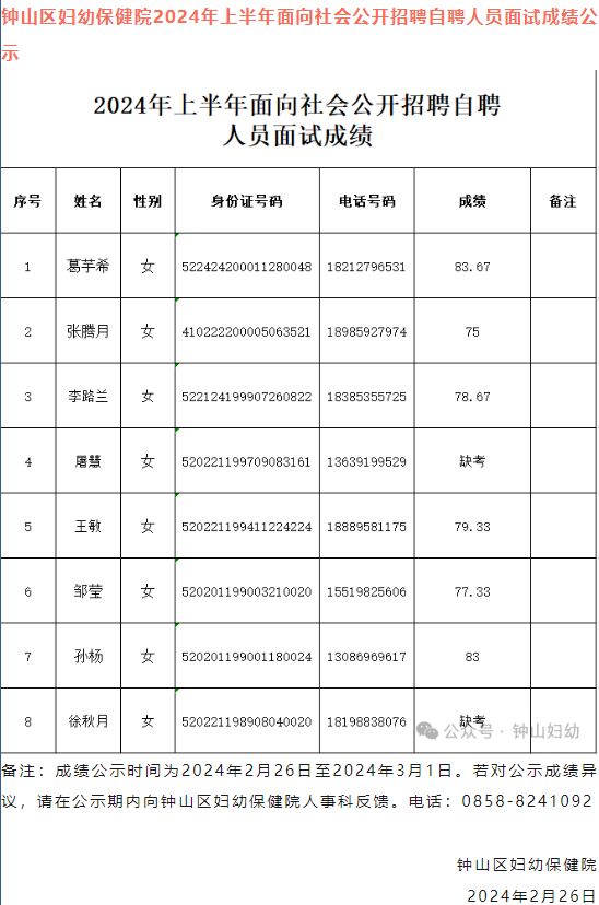 钟山区妇幼保健院2024年上半年招聘自聘人员面试成绩公示