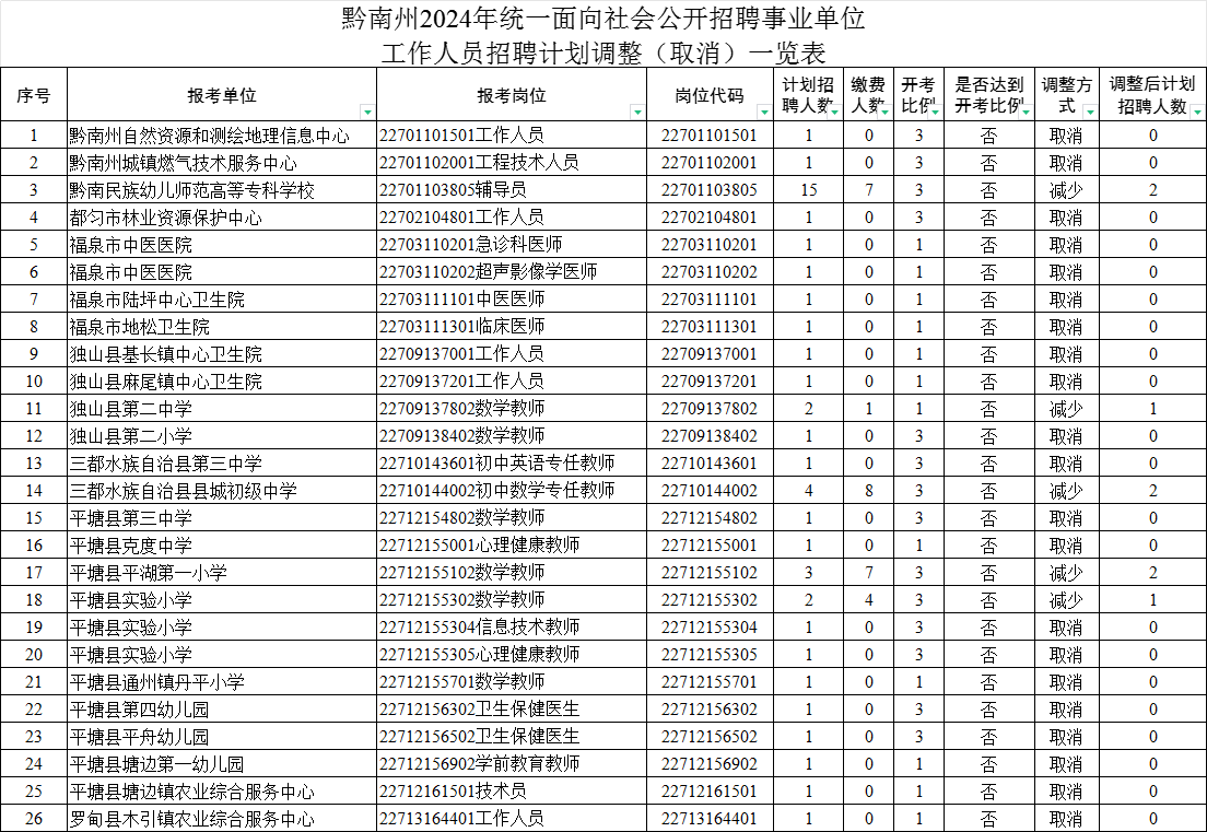 黔南州2024年统一面向社会公开招聘事业单位工作人员报名工作已经结束,截止到2024年3月1日17:00仍有部分岗位报名(缴费)人数与计划招聘人数达不到3:1比例。根据《黔南州2024年统一面向社会公开招聘事业单位工作人员简章》规定,“网上缴费结束后,报名人数与计划招聘人数达不到3:1比例的(县级卫生事业单位医疗医技专业技术人员、乡镇〈不含街道〉事业单位所有工作人员的岗位除外)岗位,该岗位招聘计划予以减少或取消;招聘计划减少的,该岗位的报考人员不得进行岗位调整。招聘计划取消的,由报考该岗位的考生本人申请,经州招聘领导小组审核同意后,给予改报符合报考条件的岗位。因所报考岗位取消且本人自愿放弃报考或无适合岗位改报的,考务部门给予退费。改报岗位和退费的截止时间为2024年3月3日17:00。州招聘领导小组在报名结束后对减少、取消的岗位在网上进行公示。”