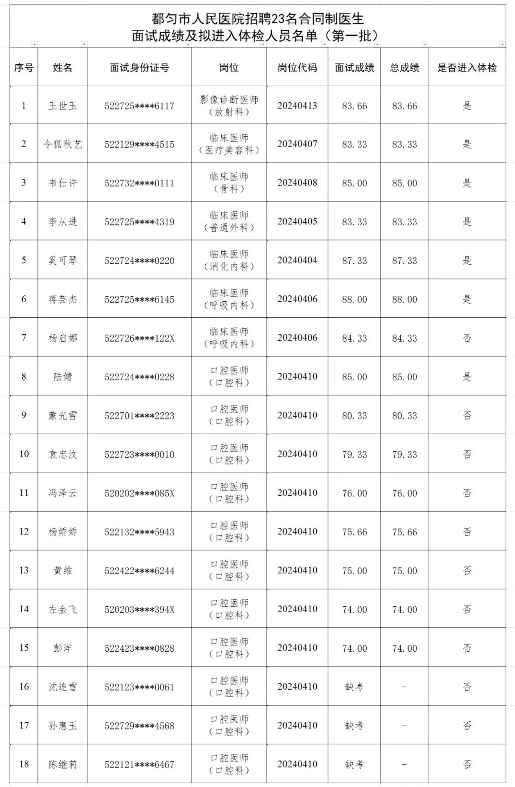 根据《都匀市人民医院招聘23名合同制医生简章》(以下简称《招聘简章》)规定,都匀市人民医院招聘23名合同制医生第一批面试工作已完成,现将面试成绩及拟进入体检人员名单等有关事宜公告如下。