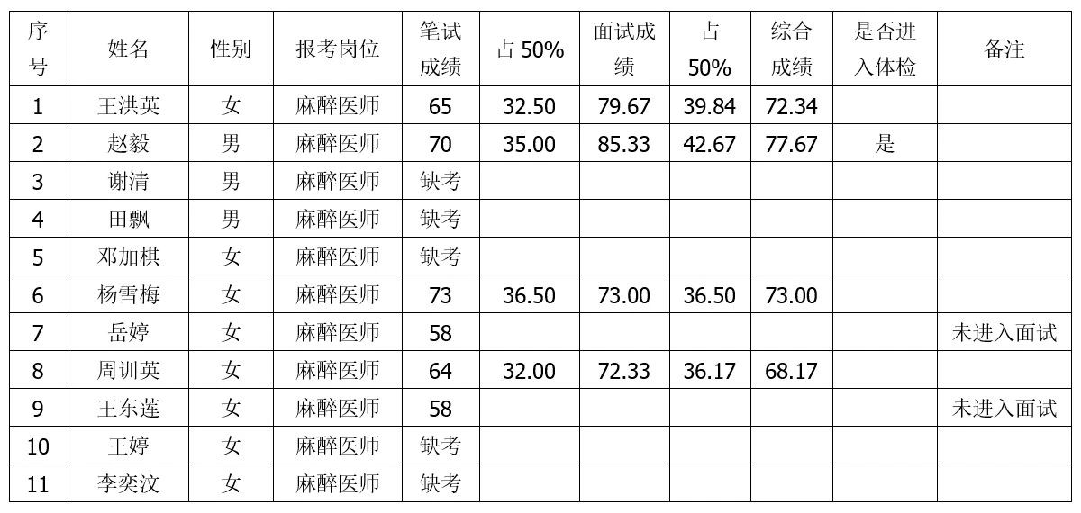 根据《六盘水市钟山区人民医院面向社会公开招聘编制外医务人员公告》规定,经报名、资格审查、笔试、面试等程序,现将综合成绩及进入体检人员予以公示: