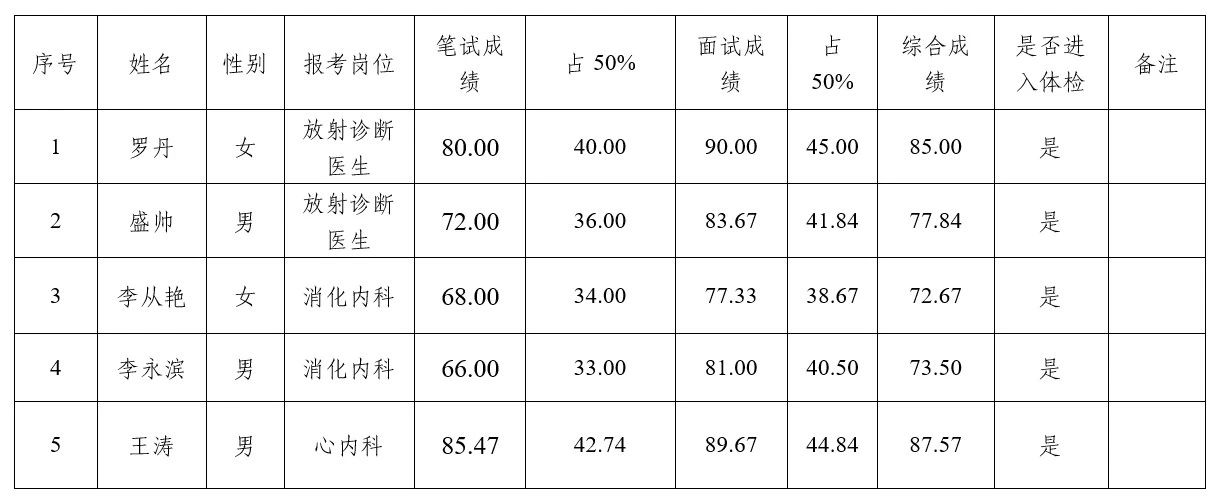 根据《六盘水市钟山区人民医院面向社会公开招聘编制外医务人员公告》规定,经报名、资格审查、笔试、面试等程序,现将综合成绩及进入体检人员予以公示: