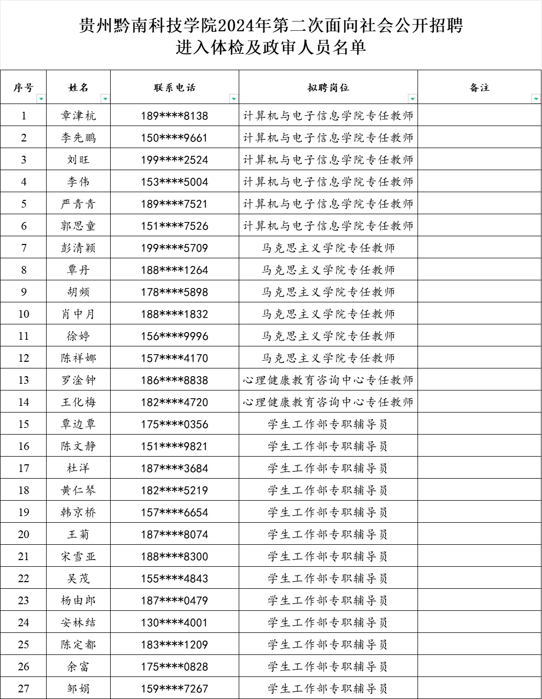 贵州黔南科技学院2024年第二次面向社会公开招聘工作已结束,经个人报名、资格审查、笔试、面试(试讲)等程序,现将进入体检及政审阶段相关事宜公告如下: