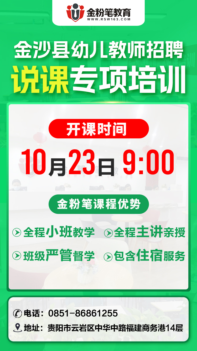 贵州金粉笔2024年金沙县幼儿教师面试专项班来了,开课时间10月23日,培训内容说课,全程主讲老师带领,小班授课,包住宿,严格督学。金沙县幼儿教师面试班预订及咨询:13368515037(微同)。