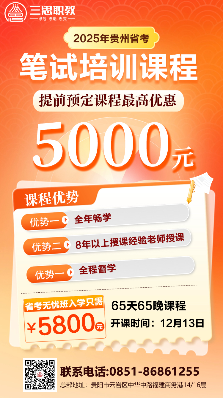 贵州金粉笔.三思职教2025年贵州省考笔试专项班优惠活动来了,省考笔试开课时间2024年12月13日开课,在开课前预定省考培训班,可享5000元优惠,班次有协议班和笔试特训班,报省考协议班,一年畅学,前期只需5800元,65天课时,进入体检再不尾款。2025年省考笔试课程预订及详情咨询:13368515037(微同)。