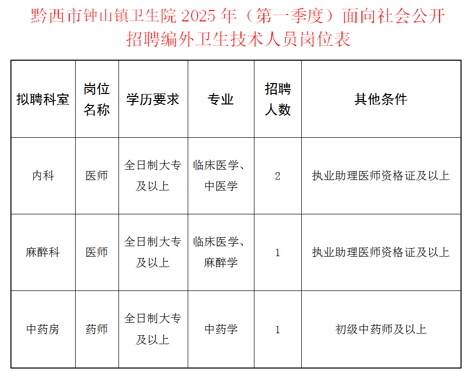 招聘岗位及要求详见《黔西市钟山镇卫生院2025年面向社会公开招聘编外卫生技术人员岗位表》。
