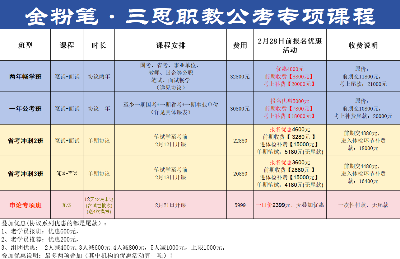贵州金粉笔.三思职教2025年贵州公考培训专项班来了,班次有两年畅学班、一年公考班、省考专项班,班次不同,学习时长和课程类别不同,省考冲刺2班开课时间2月12日(学至考前),省考冲刺3班开课时间2月18日(学至考前),省考申论专项班开课时间2月21日,班次适用于有一定学习基础的考生考前冲刺提升,在2月20日前报班,还可享受对应班次课程活动优惠,具体详见省考培训专项班课程,详情咨询及课程预订:13368515037(微同)。
