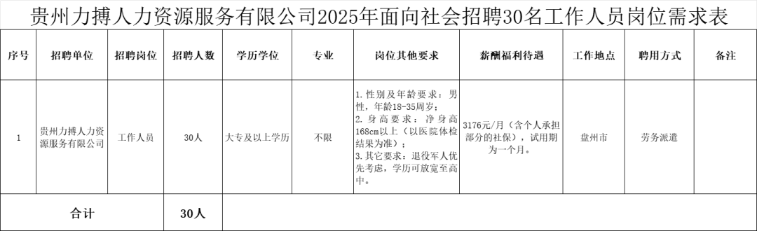 根据公司业务发展需要,贵州力搏人力资源服务有限公司现面向社会公开招聘工作人员30名,具体招聘岗位及要求详见《贵州力搏人力资源服务有限公司2025年面向社会招聘30名工作人员岗位需求表》(附件1)。