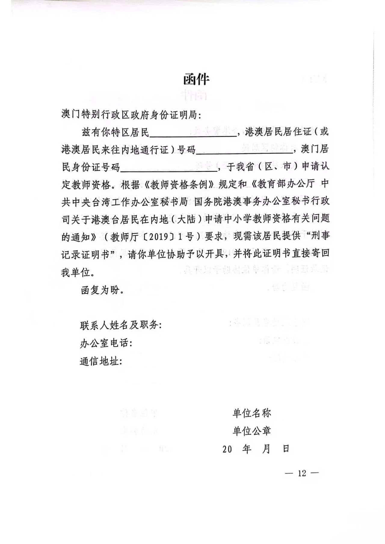 港澳台居民无犯罪记录证明由申请人自行到香港特别行政区、澳门特别行政区和台湾地区的有关部门开具。港澳地区由申请人填写《无犯罪记录证明函件》后交给现场确认点,待省级教师资格认定机构填写盖章完毕后,通知申请人领取,再由申请人自行携带函件到香港或澳门的警务部门办理无犯罪证明,港澳警务部门核实后,将核查结果反馈给出具函件的省级教师资格认定机构,省级教师资格认定机构再将核查结果通知有关教育局作为认定依据,具体的办理程序请申请人咨询港澳警务部门。台湾地区由申请人自行到台湾地区相关部门开具,开好的无犯罪记录证明直接交给申请认定的认定机构。