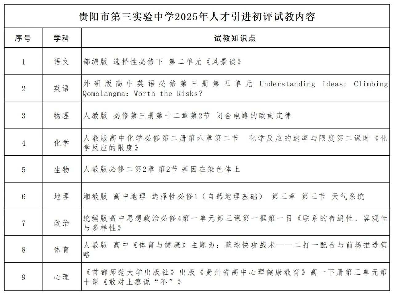 按照《第十三届贵州人才博览会贵阳贵安事业单位引进高层次及急需紧缺人才工作方案》等相关工作要求,贵阳市第三实验中学2025年人才引进报名及资格初审工作已完成。现将资格初审通过人员名单及初评相关事宜公告如下: