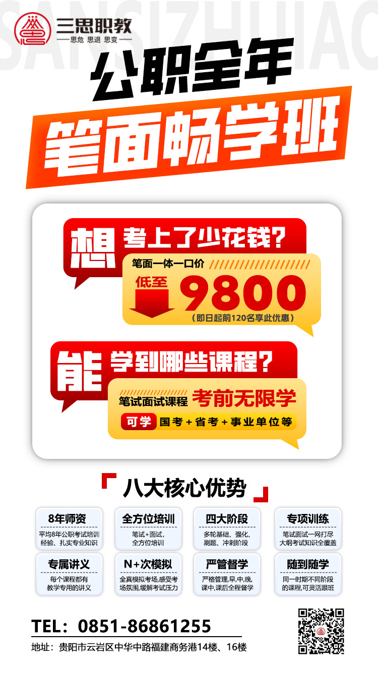 贵州金粉笔.三思职教2026年贵州省考全年班,公考畅学班(笔试+面试),在6月30日前报班,入学仅需9800元,一次性缴费,不退不补,限额120名,先报先得。国考+省考+事业单位等课程,一年均可学,上岸机会更多,越早报名学习,课时更多更划算。2026年贵州省考课程预约及咨询:13378508157(微同)。