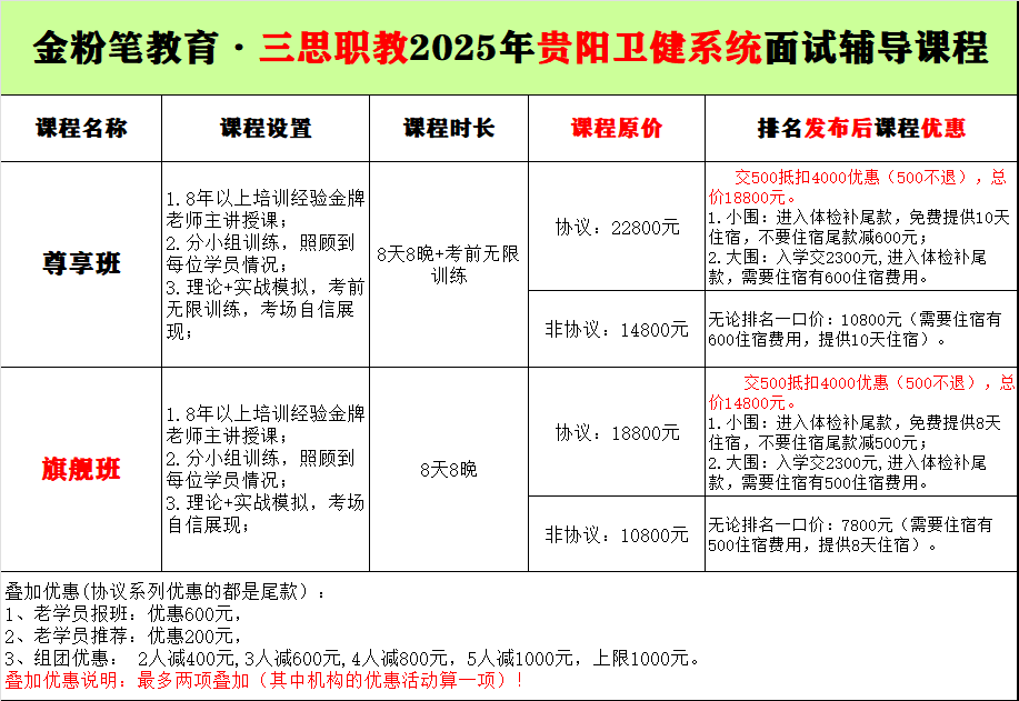 贵州金粉笔.三思职教2025年贵阳卫健委面试培训班课程来了,在职班、全职班、一对一班次均有,在开课前预约或报班,可享课程活动优惠。贵阳卫健委面试班预约或详情咨询:13368515037(微同)。