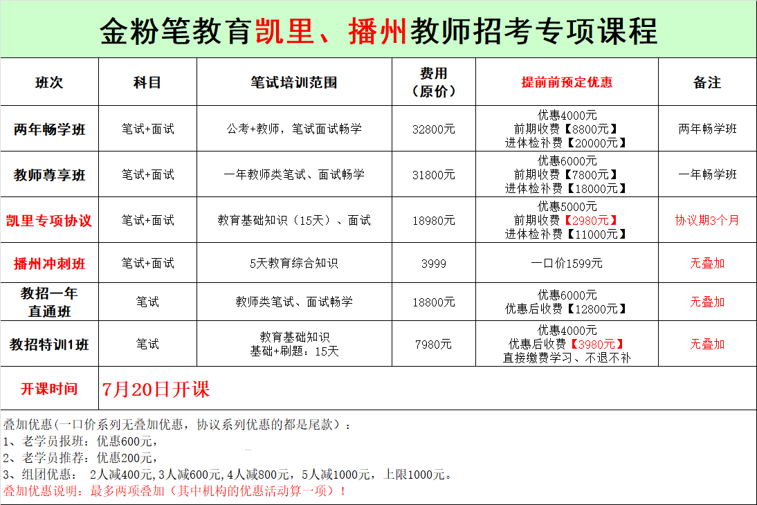 贵州金粉笔2025年凯里市、播州区教师笔试班课程来了,开课时间7月20日,培训科目《教育综合知识》,一年畅学班,全年笔面均可学,凯里市、播州区教师笔试班预约及咨询:13368515037(微同)。