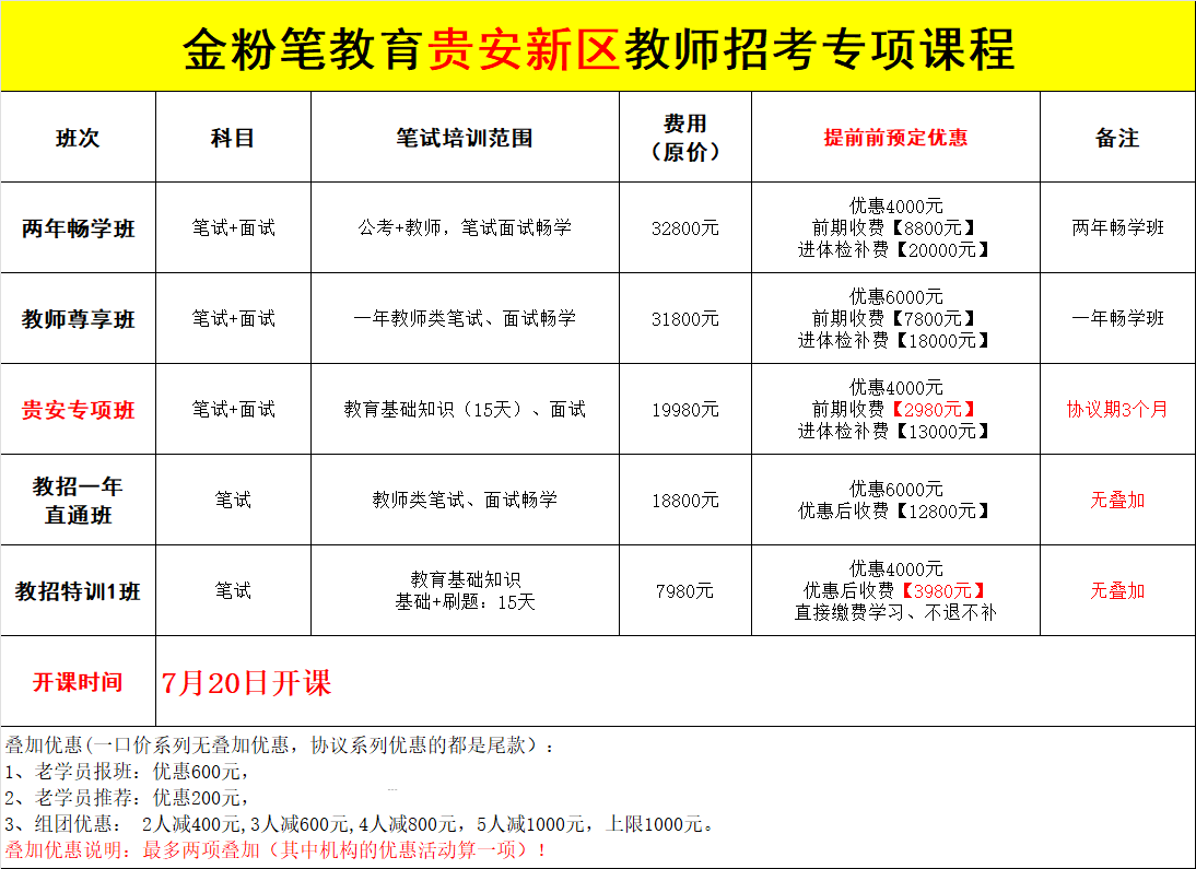 贵州金粉笔2025年贵安新区中小学教师笔试班来了,开课时间7月20日,主讲科目《教育综合知识》,班次多样,适合不同笔试基础的人群学习,可根据自身情况选择对应班次。贵安新区教师笔试班预约或咨询:13368515037(微同)。