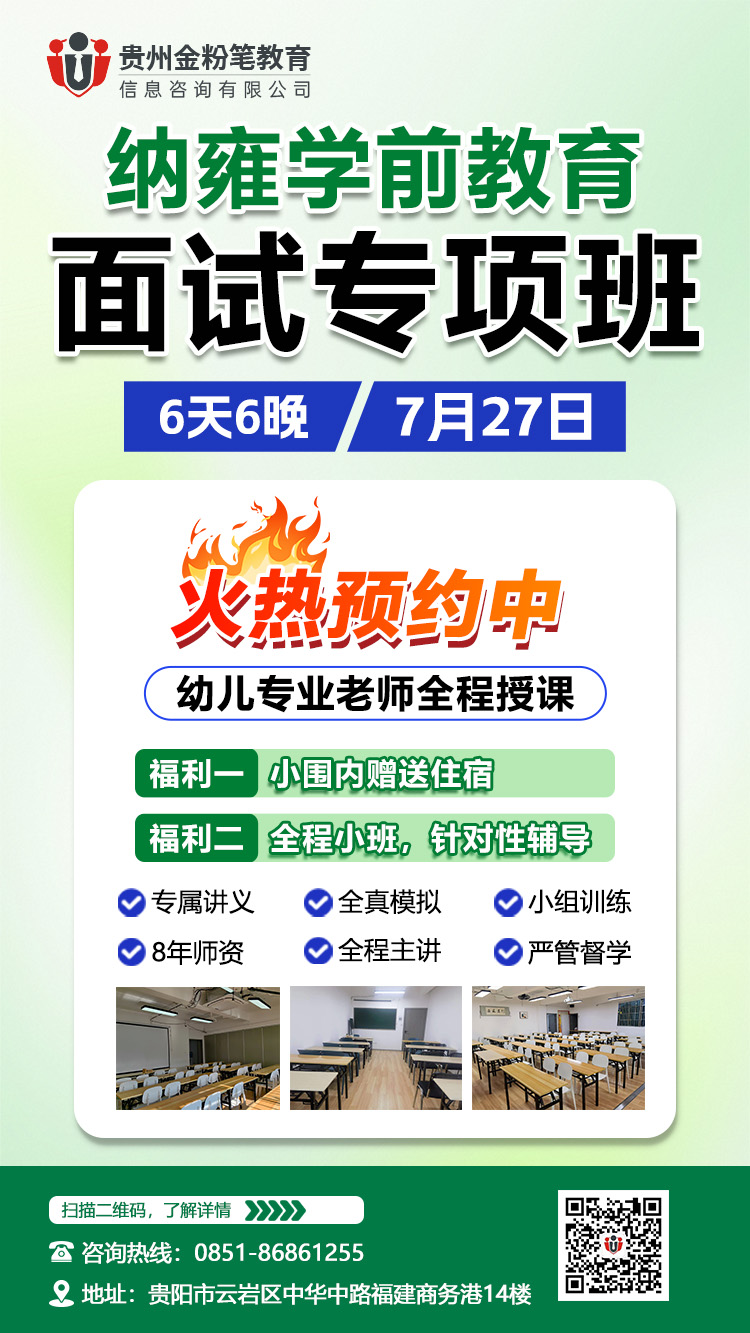 贵州金粉笔2025年纳雍县幼儿教师面试专项班来了,7月27日开课,最高可享4000元优惠,培训内容试讲。纳雍县幼儿教师面试班预约及咨询:13368515037(微同)。