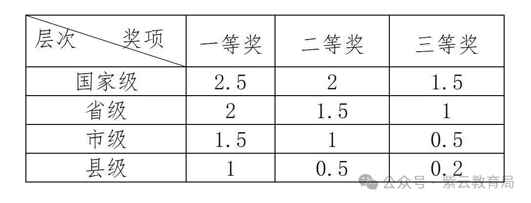 3.教学技能成绩加分:任现职以来参加各级教育行政部门组织的优质课、教学技能竞赛(含音、体、美各类大赛或带队成绩)获奖的,具体分值如下: