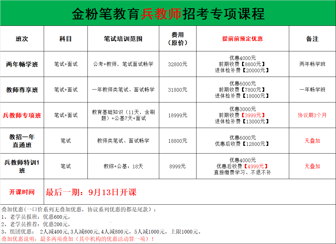 贵州金粉笔2025年贵阳市中小学“兵教师”笔试培训课程来了,最后一期9月13日开课,开课前预约课程可享优惠,贵阳兵教师笔试班预约及咨询:13368515037(微同)。